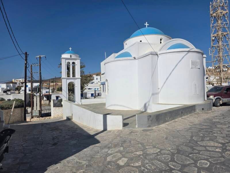 Kyrkan snett mitt emot busshållplatsen i den övre delen av Chora.