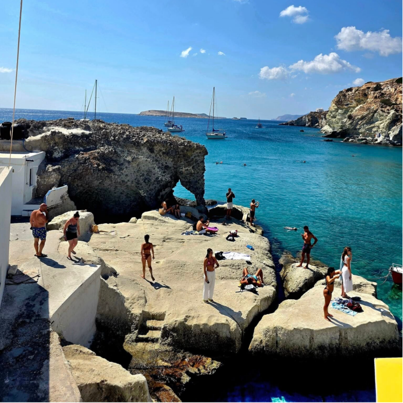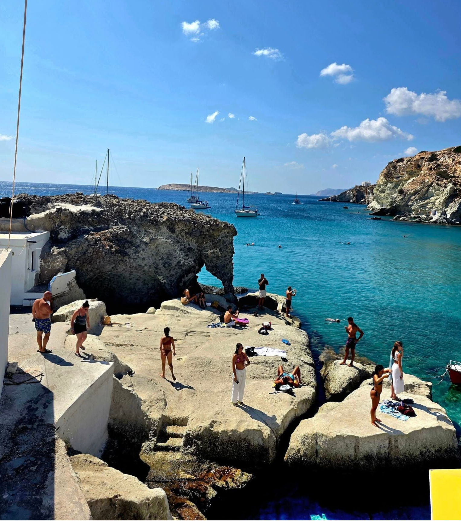 Däremot finns det härliga klippor att bada från. Här ligger Elephant Beach som jag, personligen, tycker är Kimolos häftigaste klippbad. (Ja kanske är det det häftigaste klippbadet jag sett någonsin i Grekland.) Klipporna här är underbara. Släta och solvarma och vattnet är om möjligt än mer underbart. Läs mer om Kimolos stränder här.