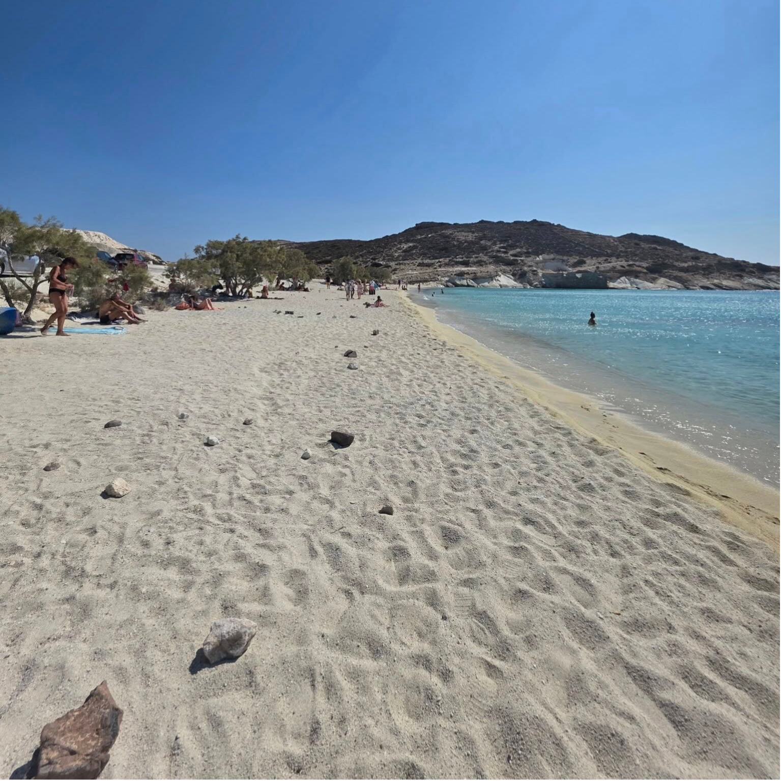 Jag kan prata mig varm om denna ljuvliga strand. Det är min favoritstrand på Kimolos! Jag föredrar den alla dagar i veckan framför den mer berömda Prassa beach. Den ligger stoppet efter Bonatsa och har helt enkelt allt en bra strand ska ha. Mjuk, ljuvlig gyllengul sand att borra ned tårna i, vackra vyer ut över vattnet, träd som ger skugga och klart, lugnt smaragdgrönt vatten. Dessutom finns här en mycket omtyckt taverna (Kalamitsi tavern) precis intill (du kan läsa mer om den här). Det gör ju inte saken sämre precis. Den ligger väldigt nära Milos och du kan se Appolonia från stranden. Buss går även hit.