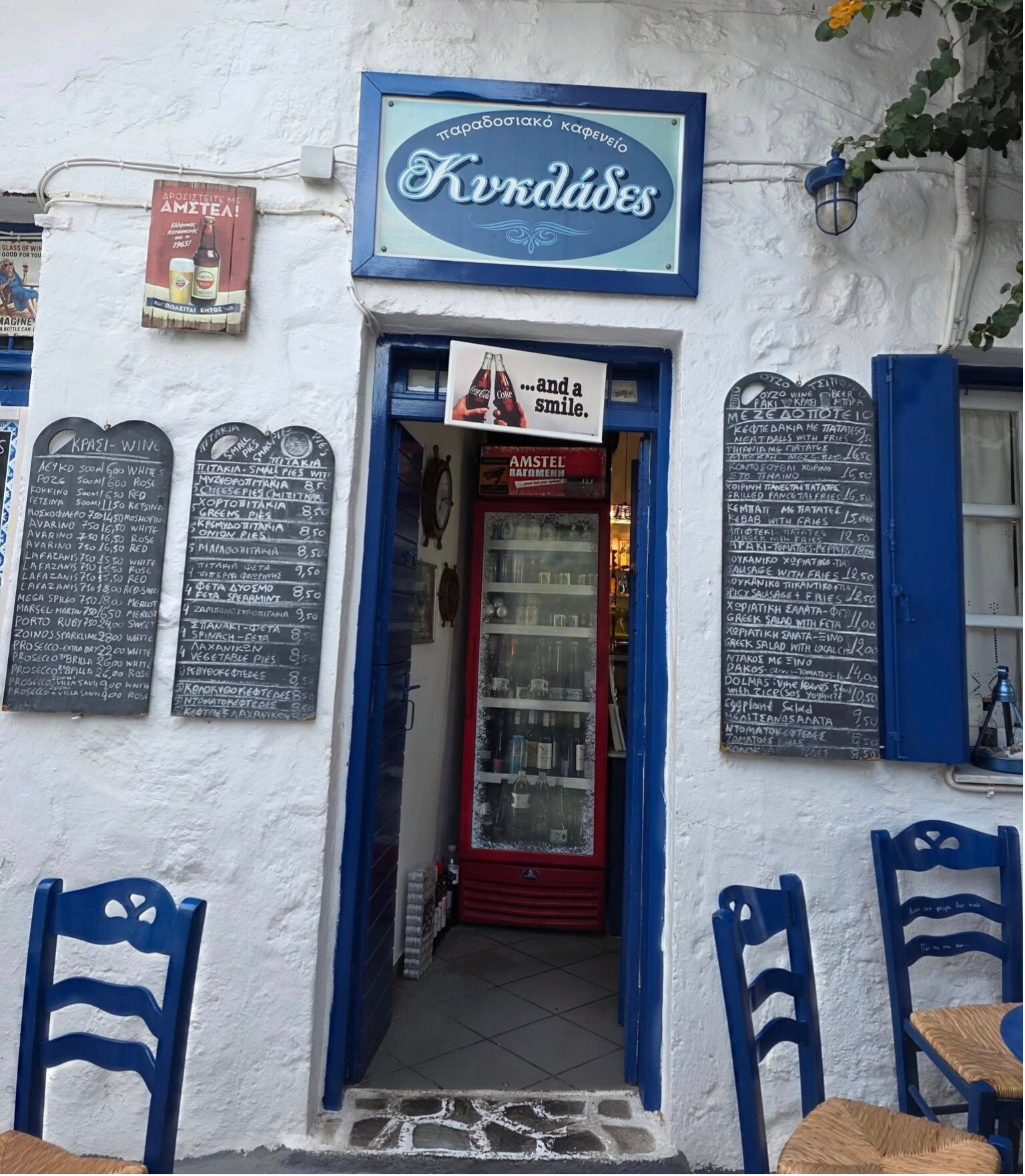 Kyklades är en liten ouzeria som ligger i en gränd i Chora. För dig som eventuellt inte redan känner till det så är Ouzerior en traditionell inrättning i Grekland där det serveras enklare rätter (som passar särskilt bra till Ouzo) och goda tilltugg. Idag kan du alltid beställa även annat än Ouzo att dricka till maten.